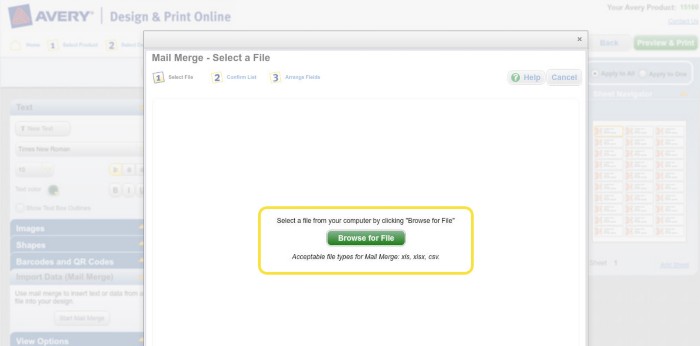 How to Mail Merge in Design & Print | Avery.com Step 3: Customize. If you chose a blank design, with no text or images, click on the "Import Data / Mail Merge" icon on the left side of this step. If the design you choose has text, click on the text box first and then click on the "Import Data / Mail Merge" icon. Click on the "Start Import/Merge" icon to begin the mail merge process.